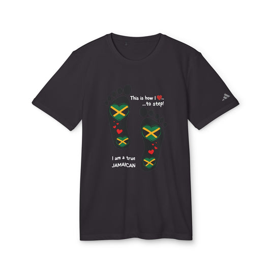 adidas® Unisex Sport T-shirt - LoveJustJules Heart-Shaped Flag of Jamaica in Footprints Top - A Fusion of Style, Patriotism, and adidas® Quality