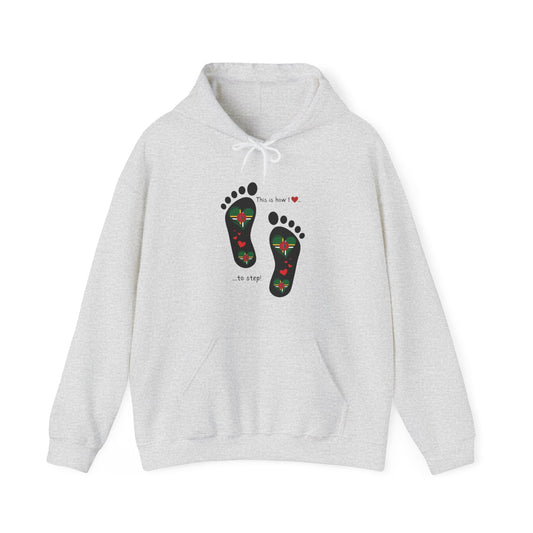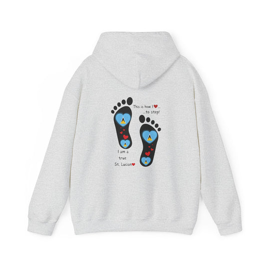 Elevate Your Style with LoveJustJules's St. Lucian Heart-Shaped Flag in Footsteps Hooded Sweatshirt.