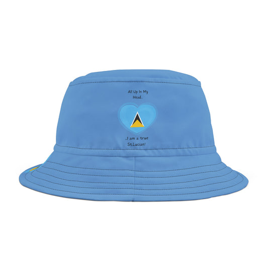 Blue St. Lucian Heritage Heart-Shaped Flag Bucket Hat with 'All Up In My Head... I am a True St. Lucian' Text