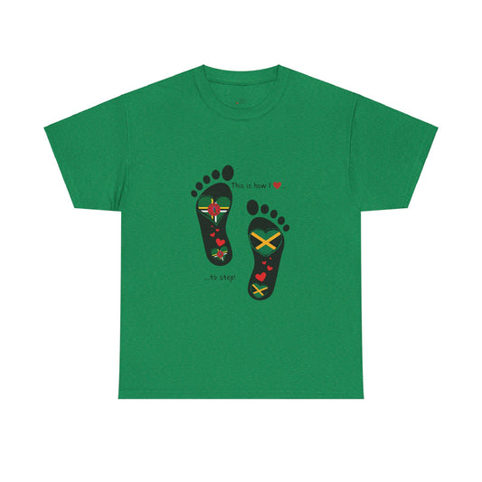 Jamaica & Dominica Flag in Footsteps Tee: Unique Unisex Soft style tee-Shirt for Dual Heritage Pride! Island Flag Fusion Apparel