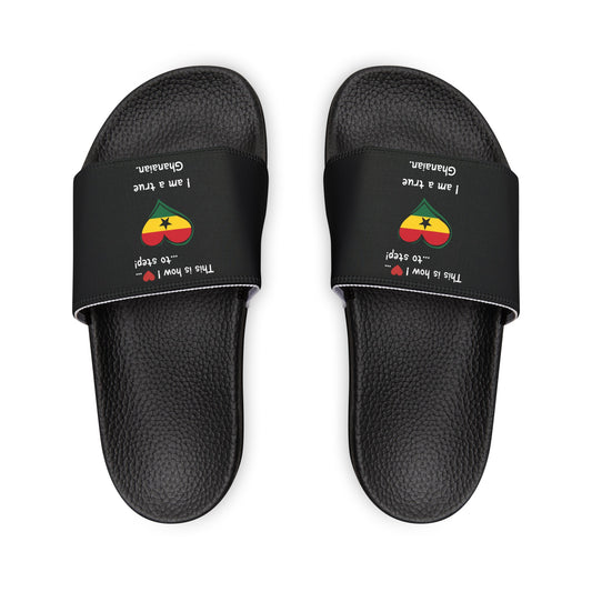 Men's PU Slide Sandals - Step into the vibrant culture of Ghana with our Heart-shaped Ghanaian flag slider footwear from LoveJustJules!